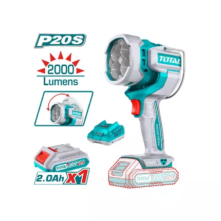Specifications: Brand: Total Model: TWLI20881 Type: Work Lamp Voltage:20V LED power dissipation:22.5W Lumens:2000±10% Ergonomic grip with softgrip The LED lamp head can be swivelled through 130° degrees 1 Pcs 2.0Ah battery pack(TFBLI20011) 1 Pcs charger(TFCLI2001) Packed by color box