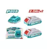 Specifications: Brand: Total Model: TFBCPK1222 Type: Battery & Charger Kit Voltage: 20V With 2pcs lithium-ion battery pack (TFBLI20011) With 1pcs charger (TFCLI2001) Lithium-ion battery pack (TFBLI20011): Lithium-ion 2.0Ah battery LED battery power indicator One battery fits all P20S multiple tools Fast intelligent charger (TFCLI2001): Input voltage: 220-240V~50/60Hz Output voltage: 20V Output current: 2A Packed by double blister