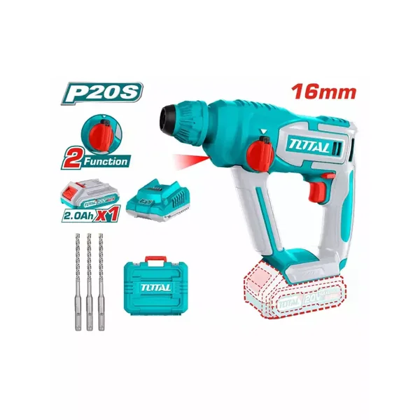 The Total TRHLI201681 cordless rotary hammer drill combines power and versatility. Its 20V lithium-ion battery delivers 1.5J of impact energy for efficient concrete drilling, while also being capable of handling wood and iron. Supplied as a complete kit with bits, battery, and charger, it's ready for a wide range of drilling tasks.