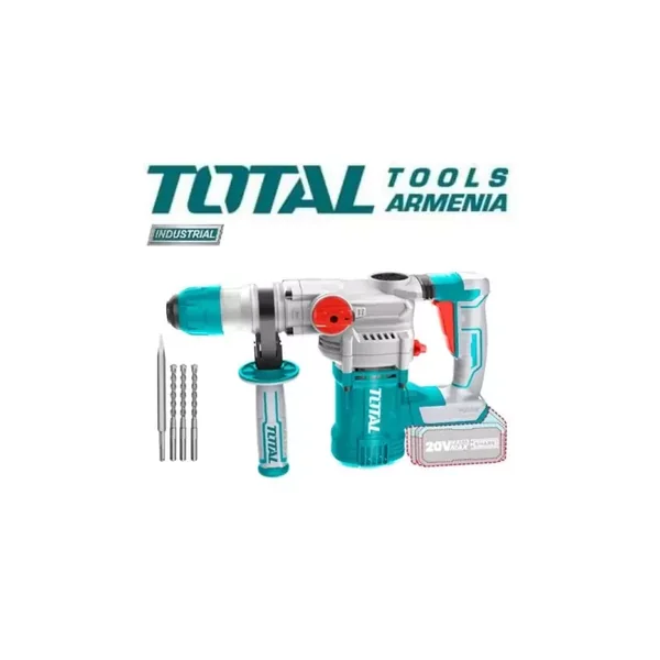 The Total TRHLI202882 is a powerful 20V cordless rotary hammer drill, designed for heavy-duty drilling and chiseling in concrete, steel, and wood. This complete kit includes essential accessories like batteries, a charger, drill bits, and a carrying case for maximum job-site convenience and performance.
