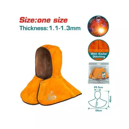 Specifications: Brand: Total Model: TSP20101 Type: Welding Accessories Size: one size 1.1-1.3mm Spilt cowhide, hook and loop tape, polyester taffeta lined, FR thread stitched. Protect the head during welding work Packed by poly bag