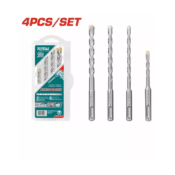 This Total Drill Bit Hammer Set provides four essential SDS Plus hammer drill bits for a range of masonry drilling tasks, conveniently packed in a double blister for secure storage and retail display.