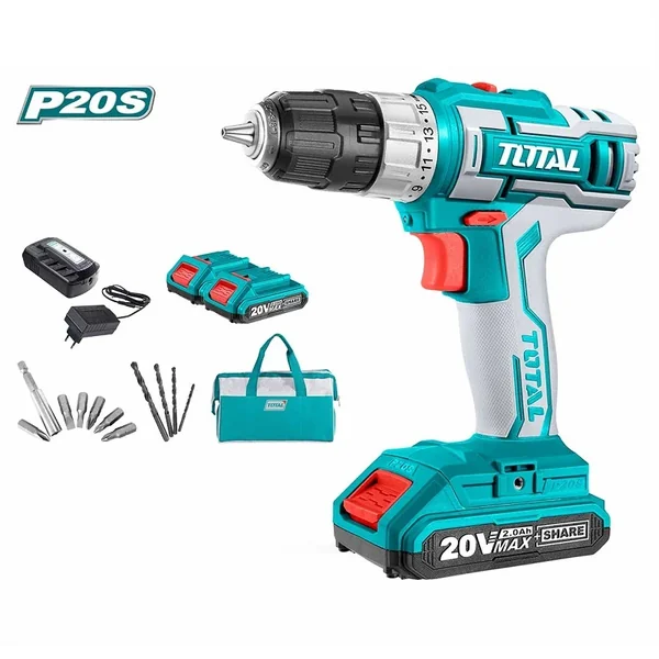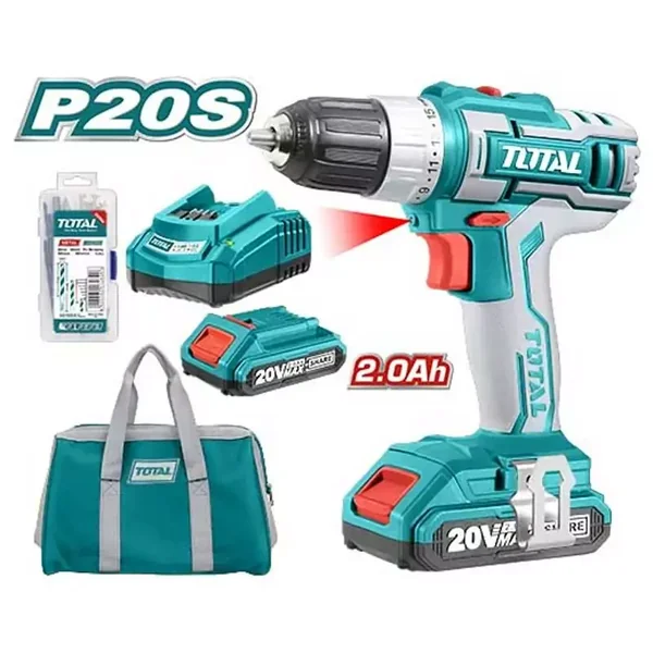 The Total Drill Machine TDLI2002 is a powerful and versatile 20V cordless drill driver, designed for a wide range of drilling and fastening tasks. It comes as a complete kit with batteries, charger, and a comprehensive set of accessories for immediate use.