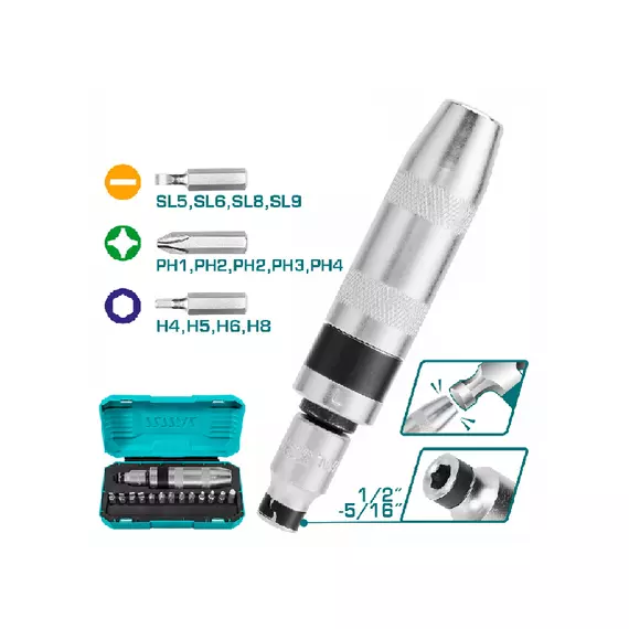 Specifications: 1 pcs impact driver 1 pcs 1/2""-5/16"" sleeve adapter 13 pcs screwdriver bits: SL5、SL6、SL8、SL9、PH1、PH2*2、PH3、PH4、H4、H5、H6、H8 Screwdriver bits: Nickel plated Material: Cr-V, Heat treatment Packed by plastic box