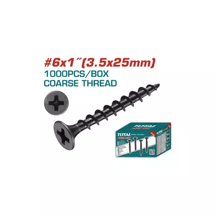 Specifications: BRAND: TOTAL MODEL: THWDS611 TYPE: DRYWALL SCREW #6X1"(3.5X25MM) COARSE THREAD MATERIAL: HIGH QUALITY CARBON STEEL 1000 PCS IN COLOR BOX PHILLIPS DRIVE BUGLE HEAD BLACK PHOSPHATED FINISH PACKED BY COLOR BOX