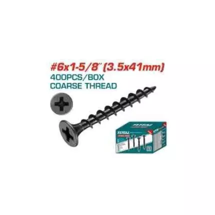 Specifications: BRAND: TOTAL MODEL: THWDS61581 TYPE: DRYWALL SCREW #6X1-5/8"(3.5X41MM) COARSE THREAD MATERIAL: HIGH QUALITY CARBON STEEL 400 PCS IN COLOR BOX PHILLIPS DRIVE BUGLE HEAD BLACK PHOSPHATED FINISH PACKED BY COLOR BOX