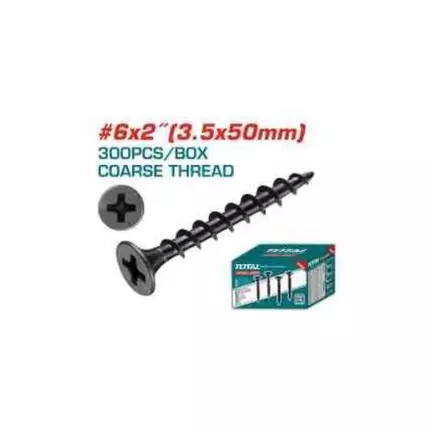 Specifications: BRAND: TOTAL MODEL: THWDS621 TYPE: DRYWALL SCREW #6X2"(3.5X50MM) COARSE THREAD MATERIAL: HIGH QUALITY CARBON STEEL 300 PCS IN COLOR BOX PHILLIPS DRIVE BUGLE HEAD BLACK PHOSPHATED FINISH PACKED BY COLOR BOX