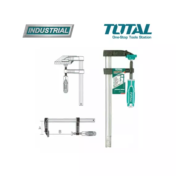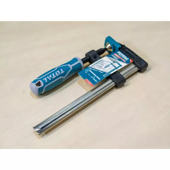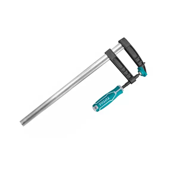 Heavy duty industrial grade 150mm (6 inches) forged carbon steel F-shaped bar clamp, mainly used for clamping pieces of wood while joining with glue or fastening with screws. Suitable for joining smaller work pieces, for example small boxes and drawers, from 0-150mm / 0-6” in length. Consists of a fixed jaw and a movable jaw with an attached spindle, that together slides along a rail bar. This allows the clamp opening to be set accordingly, typically to the size of the work piece. A thermoplastic rubber handle provides a comfortable grip when rotating the spindle, which in turn controls the final clamping pressure. In addition, the tip of the spindle has a swivel pivot, to ensure a tight grip even in irregularly shaped work pieces. The clamping plates of the jaws are covered by plastic pads for protecting the work piece. It still is recommended, though, to insert a thin scrap of wood between the work piece and the jaws on both sides, for added protection and leverage. The rail bar is 15mm wide x 5mm thick, tough enough for most basic home improvement jobs. Best for wood working joinery, particularly for securely holding while curing glued joints. Features: Malleable steel jaws with PVC covers Powder coated for rust prevention Thermoplastic rubber quick release turn handle Adjustable pressure design Specifications: Brand: Total Model: THT1320501 Type: F Clamps Clamp size: A * B : 50mm * 150mm Clamp size: 50X150mm Max clamp force: 170kgs Thickness and width of iron ruler: 5 X 15mm Diameter of screw thread: 11mm Packed by paper card