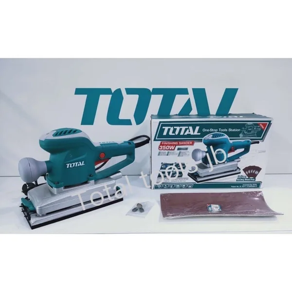 The Total Finishing Sander 350W TF1302206 is a powerful and efficient tool designed for smooth finishing work on various surfaces, featuring a durable aluminum base and including essential sanding papers for immediate use.