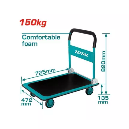 Specifications: Brand: Total Model: THTHP11502 Type: Hand Truck Capacity: 150kgs Steel handle with comfortable foam 4"PU wheel Platform size: 725X472mm Over size: H820Xh135XL725XW472MM Pb-free and UV resistant powder coating non-slip PVC mat GS certification Packed by paper card