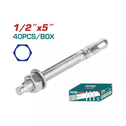 Specifications: Brand: Total Model: THWWA2151 Type: Galvanized Wedge Anchor Size: 1/2"x5" Qty: Pack of 40pcs Material: High quality carbon steel Zinc plated finish Packed in color box