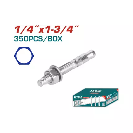 Specifications: Brand: Total Model: THWWA141341 Type: Galvanized Wedge Anchor Size: 1/4"x1-3/4" Qty: Pack of 350pcs Material: High quality carbon steel Zinc plated finish Packed in color box