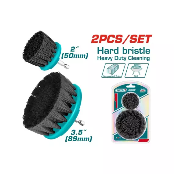 Features: Hard brushes are used to polish the cleaned surfaces. The bristles of the brush are made of nylon material, thanks to which the brush can be used more than once. Head mounting rod type: hex. Specifications: BRAND: TOTAL MODEL: TACH1235 TYPE: CLEANING BRUSH INCLUDES: 1PCS 2" HARD BRISTLE BRUSH, 1PCS 3.5" HARD BRISTLE BRUSH HARD BRISTLE FOR: SIDING, GLASS, AND OTHER LIGHT DUTY CLEANING APPLICATIONS DURABLE NYLON BRISTLES FOR: EXTENDED BRUSH LIFE PACKED BY DOUBLE BLISTER