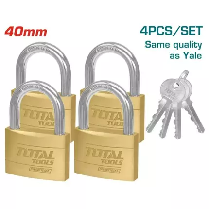 Specification : Brand: Total Model: Brass Type: Brass Padlock Set Sleeve Size: 40mm, 4pcs/set Single lock weight: 142g Lock body material: Brass Solid brass cylinder with pins Brass keys and parts for longer service life With 4 pcs brass keys Packed by double blister