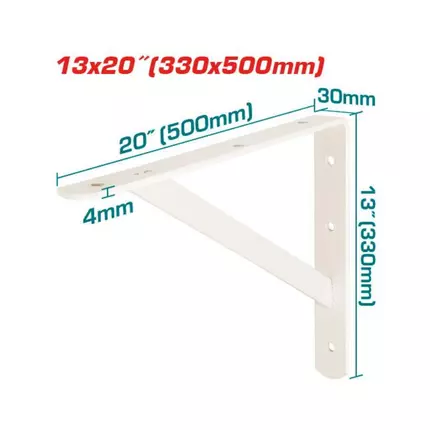 Specifications: Brand: Total Model: THDSB1320 Type: Shelf Bracket Bracket Dimensions: 13 Inch x 20Inch(330 x 500mm) Thickness: 4mm Capacity load capacity (per pair): 200kgf 6 attachment points Color: White Mounting accessories not included