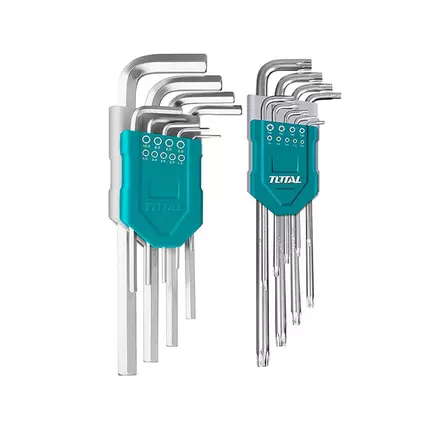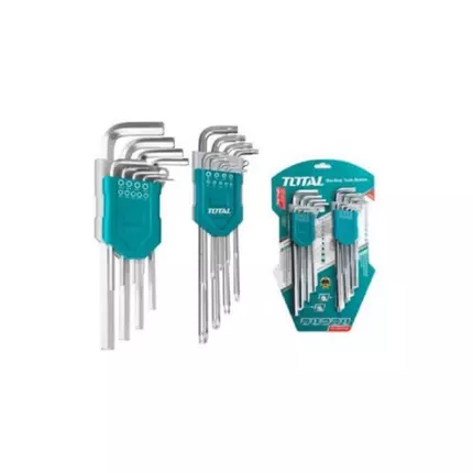 Specifications: Brand: Total Model: THT106KT0181 18 Pcs Hex Key And Torx Key Set Size Hex: 1.5-10mm Torx: T10-T50 Extra-long arm Material: Cr-V Heat treatment and chrome plated Packed by double blister. Include: 9 Pcs Hex Key Size:1.5-10mm 9 Pcs Torx Key