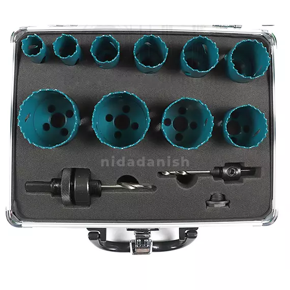 Specifications: Hole Saw 12pcs Set 9 pcs Hole saws: 20mm (25/32″), 22mm (7/8″), 25mm (1″), 29mm (1 1/8″), 32mm (1 1/4″), 35mm (1 3/8″), 38mm (1 1/2″), 44mm (1 3/4″), 48mm (1 7/8″), 50mm (1 31/32″) 1 pc Arbor: 1/4″ Round shank, fit size: 9/16″ ~ 1 3/16″ 1 pc Arbor: 7/16″ Hex shank, fit size: 1 1/4″ ~ 8 17/64″ 1 pc Adaptor: for 1/2″ – 20 thread arbors to fit 5/8″ 18 thread hole saws Packed by Aluminum Case