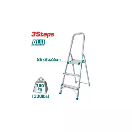 Specifications: Brand: Total Model: THLAD06031 Type: Ladder Material: Aluminium Steps: 3 steps Distance between two steps: 233mm Distance between top step and handle: 605mm Distance from ground to top step: 629mm Top aluminum step,size: 260x250x30mm Approx.Wt: 2.52kg Max.Load: 150kg Packed by shrink