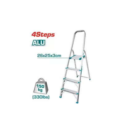 Specifications: Brand: Total Model: THLAD06041 Type: Ladder Material: Aluminium Steps: 4 steps Distance between two steps: 219mm Distance between top step and handle: 611mm Distance from ground to top step: 877mm Top aluminum step,size: 260x250x30mm Approx.Wt: 3.3kg Max.Load: 150kg Packed by shrink