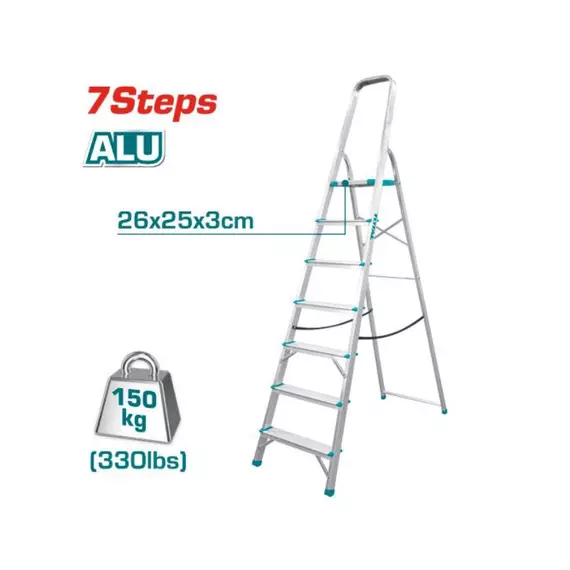 Specifications: Brand: Total Model: THLAD06071 Type: Ladder Material: Aluminum Steps: 7 steps Distance between two steps: 233mm Distance between top step and handle: 605mm Distance from ground to top step: 1500mm Top aluminum step,size: 260x250x30mm Approx.Wt: 4.9kg Max.Load: 150kg Packed by shrink
