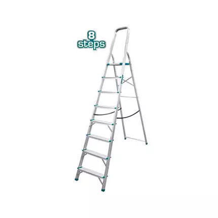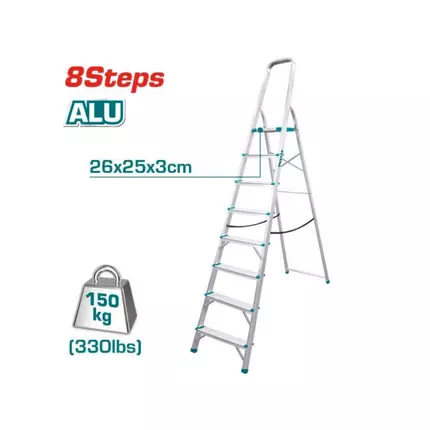 Specifications: Brand: Total Model: THLAD06081 Type: Ladder Material: Aluminum Steps: 8 steps Distance between two steps: 233mm Distance between top step and handle: 605mm Distance from ground to top step: 1718mm Top aluminum step,size: 260x250x30mm Approx.Wt: 5.4kg Max.Load: 150kg Packed by shrink