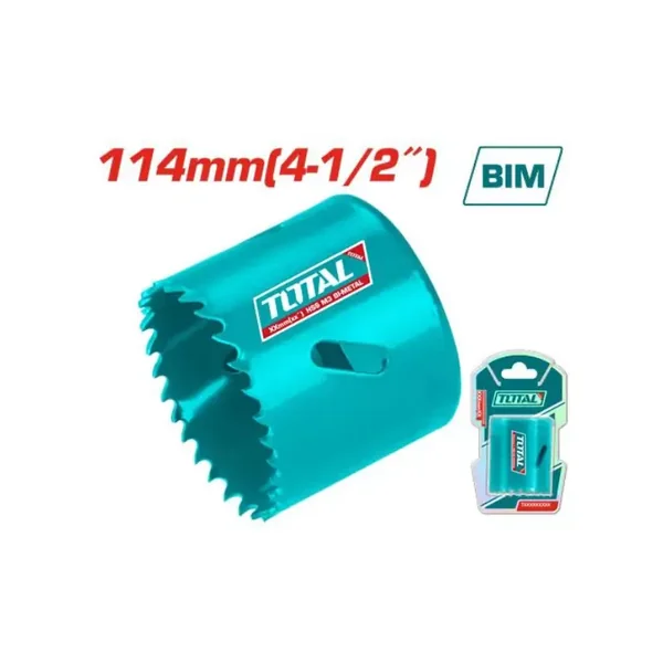 The Total TAC4111412 is a professional-grade 114mm hole saw designed for cutting clean, precise holes in a variety of tough materials. Its bi-metal HSS M3 construction and variable tooth design ensure durability and efficient performance.