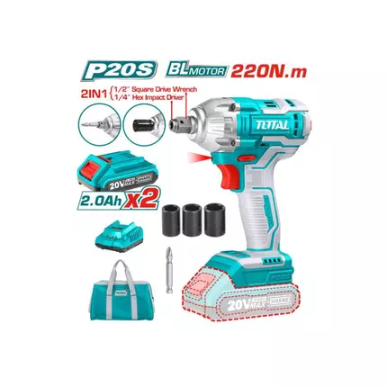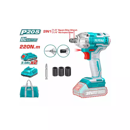Specifications: Brand: Total Model: TIWLI20208 Type: Impact Wrench Brushless motor Voltage: 20V Square drive: 1/2" No-load speed: 0-1300/0-2300rpm Impact rate: 0-2000/0-3300bpm Max torque: 220Nm Integrated LED work light 3 Pcs sockets(17,19,21mm) 1 Pcs screwdriver bit 2 Pcs 2.0Ah battery pack(TFBLI20011) 1 Pcs charger(TFCLI2001) Charge volts: 220-240V~50/60Hz Packed by canvas bag