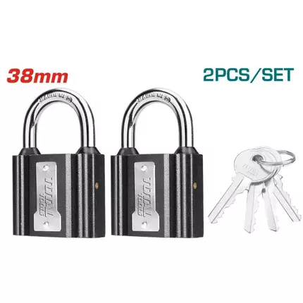Specifications: Brand: Total Type: Padlocks Sleeve Size: 38mm Quantity: 2 pieces per set Single Lock Weight: 146g Lock Body Material: Iron Brass Lock Cylinder: Iron, with 4 keys Waterproof Rubber Cover Included Packaging: Double Blister