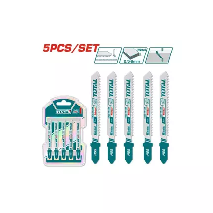 Specifications: Brand: Total Model: TAC51118A Type: Jig Saw Basic for metal Length of tooth: 50mm 21TPI HSS,wavy set,milled 5pcs/set Packed by blister card
