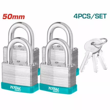 Specifications : Brand: Total Model: TLPK365004 Type: Padlock Size: 50mm Quantity: 4 pieces per set Single Lock Weight: 555g Body Material: Nickel-plated laminated steel Cylinder Material: Solid brass with bolts Housing Material: ABS for impact protection Keys: 4 iron keys Packaging: Double blister