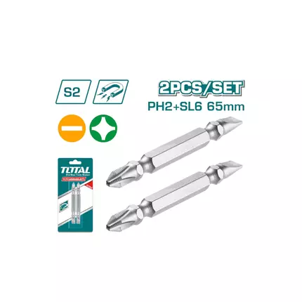 Specifications: Brand: Total Model: TAC16HL234 Type: Screwdriver Bit Size: PH2+SL6x1.0 65mm Set of: 2 pieces Material: S2 Industrial Steel Sandblasted surface Packed in blister card