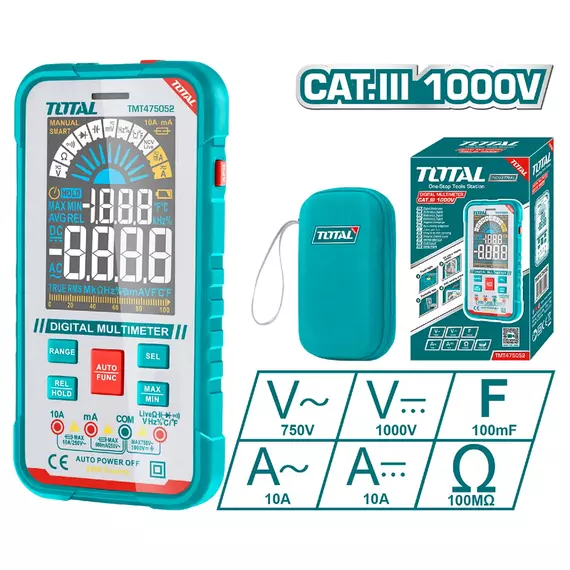 Specifications: VA COLOUR DISPLAY SCREEN TRUE RMS,10000 COUNTS DC VOLTAGE:99.99MV/999.9MV;9.999V/99.9V/1000V AC VOLTAGE:99.99MV/999.9MV;9.999V/99.9V/750V DC CURRENT:9.999MA99.99MA/600.0MA;9.999A AC CURRENT:9.999MA99.99MA/600.0MA;9.999A RESISTANCE:99.99Ω/999.9Ω/9.999KΩ/99.99KΩ/999.9KΩ/9.999M Ω;99.99MΩ□ SMART FUNCTION(AC/DC VOLTAGE, RESISTANCE, AND CONTINUITY) NCV AUTOMATIC IDENTIFICATION OF CURRENT INPUT LIVE TEST DIODE TEST' MAX/MIN/AVG RELATIVE MEASUREMENT' DATA HOLD LOW BATTERY INDICATION' AUTO POWER OFF' FLASHLIGHT