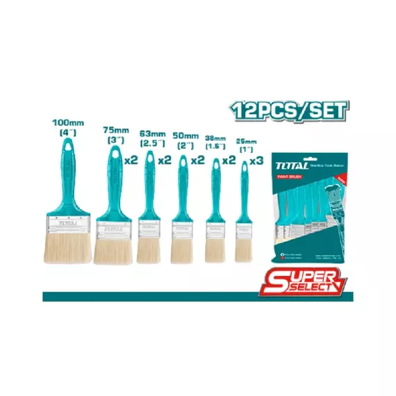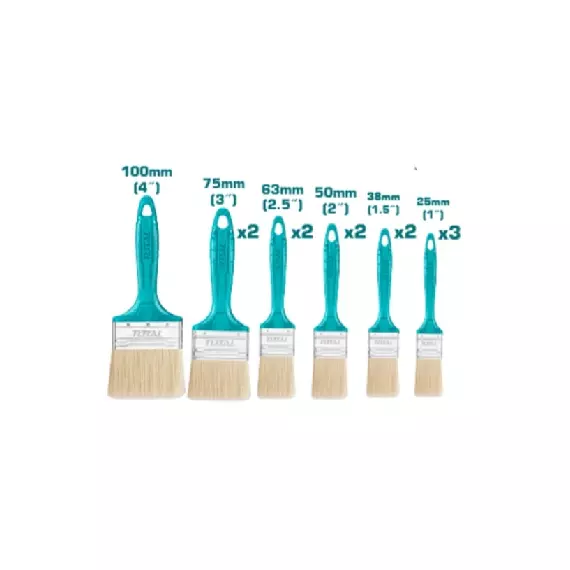 Specifications: A type set of brushes Bristle natural Quantity in a set: 12pcs Handle material plastic In the set Brushes 25 mm - 3 pc Brushes 38mm - 2pcs Brushes 50 mm - 2 pcs Brushes 63 mm - 2pcs Brush 75 mm - 2 pc Brush 100mm -1pc Set of brushes 12 pcs. Total THT84501201 - a set of flat brushes of different thicknesses for painting. The bristles of each instrument are securely fixed with a metal band. The plastic handles are equipped with hanging holes.