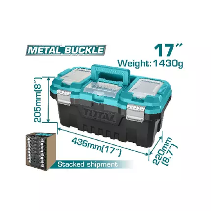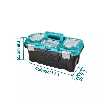 Specifications: 17" Plastic Tool Box Size : 436mm(17"")*220mm(8.7"")*205mm(8"") Material: Pp Weight:1430g Max Load : 15kg Metal Buckle High-strength Handle Upper Cover With Three Storage Areas Upper Cover With Scale Function Contains 1pcs Plastic Tray Packed By Lable