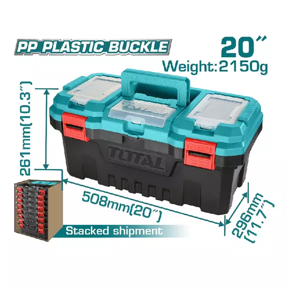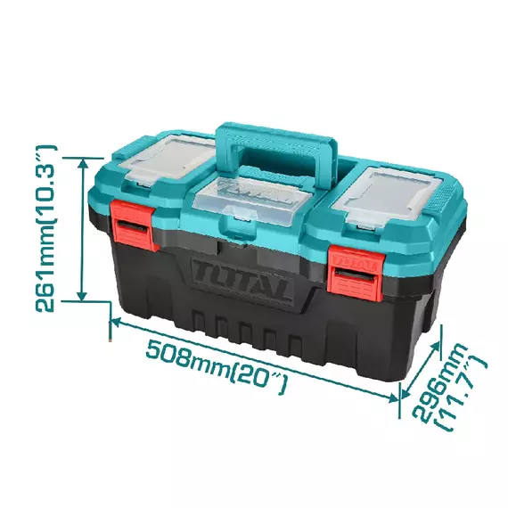 Specifications: 20" Plastic Tool Box Size : 508mm(20"")*296mm(11.7"")*261mm(10.3"") Material: Pp Weight:2150g Pp Plastic Buckle Max Load : 20kg High-strength Handle Upper Cover With Three Storage Areas Upper Cover With Scale Function Contains 1pcs Plastic Tray Packed by Labe