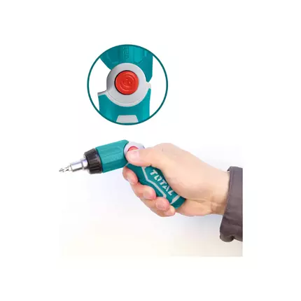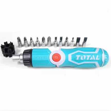 Specifications: Brand: Total Model: TACSD30136 Type: Ratchet screwdriver 1 Pcs ratchet handle (30T) Folding handle, high quality ratchet 12 Pcs 6.35*25mm screwdriver bits Size: SL4, SL5, SL6, SL7, PH0, PH1, PH2, PH3, PZ0, PZ1, PZ2, PZ3 Slotted: SL4, SL5, SL6, SL7 Phillips: PH0, PH1, PH2, PH3 Pozidriv: PZ0, PZ1, PZ2, PZ3 Material: CR-V Packed by display color box