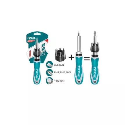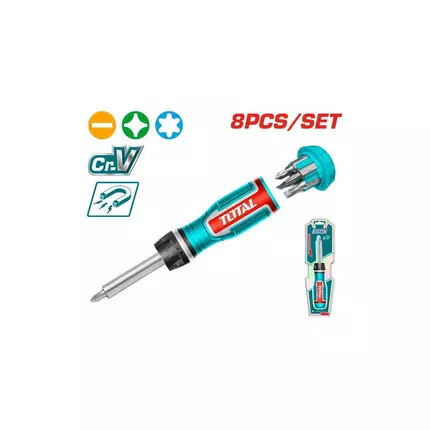Specifications: Brand: Total Model: TACSD30086 Type: Screwdriver Set 8 pcs Ratchet Screwdriver Set 1pcs High Quality Ratchet Handle(new design) 7pcs 25mm Screwdriver bitsSL5,SL6,PH1,PH2,PH3,T15,T20 Packed by half double blister Weight: 0.208kg Dimension: 24.5 x 12 x 3.5 cm