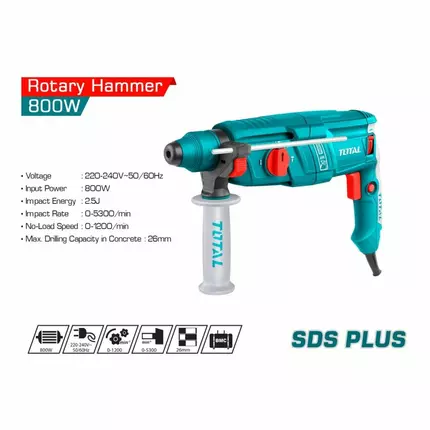 Specifications: Voltage:220-240V~50/60Hz Input power:800W No-load speed:0-1200rpm Impact rate:0-5300bpm Impact energy:2.5J Max drilling capacity, concrete:26mm, Steel:13mm, Wood:30mm with SDS plus chuck system With 3 drills and 2 chisels Packed by BMC