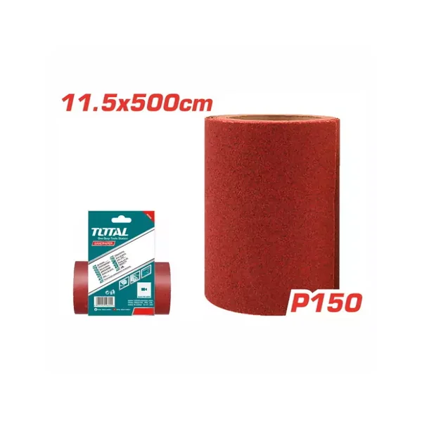This Total sandpaper roll is a versatile P150 grit abrasive, ideal for smoothing surfaces on wood, walls, and metal projects, conveniently packed on a paper card for easy storage and use.
