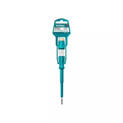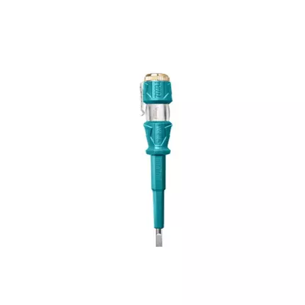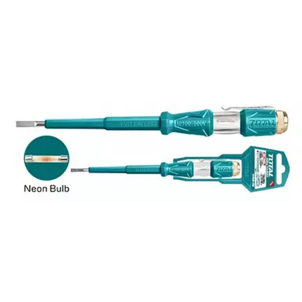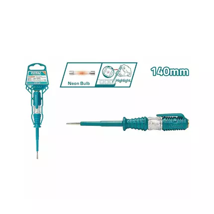 Total THT291408 has neon bulb with pocket pen clip. Specifications: Brand: Total Model: THT291408 Test voltage: AC 100-500V Neon Bulb: Yes Slotted size: 3x140mm Length: 140mm Weight: 0.04 kg Packed by plastic hanger