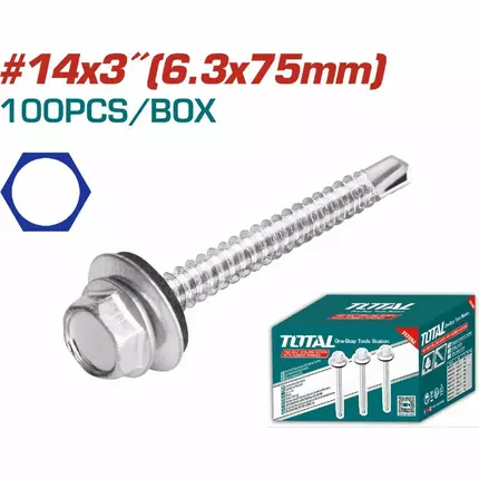 Specification: Brand: Total Tools Type: Self Drilling Screws Size: 14X3" Material: High Quality Carbon Steel Quantity: 100 Pieces Packaging: Color Box Head Type: Hexagon Flange Head with Rubber Washer Finish: Zinc Plated