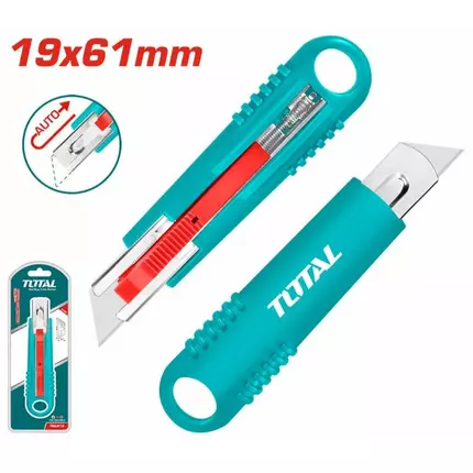 Specifications: Brand: Total Type: Utility Knife Blade Type: Self-retractable Handle: Non-slip ergonomic Blade Size: 19 x 61mm Length: 140mm Additional Feature: Flat push button Packaging: Sliding Card