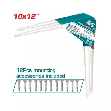 Specifications: Brand: Total Model: TSB11012 Type: Shelf Bracket Bracket Dimensions: 10 Inch x 12 Inch(25*30 cm) Thickness: 1.2mm Capacity load capacity (per pair): 30 kgf 6 attachment points Color: White Includes: 2 pcs Shelf Brackets, 12 screws attachment Packed by paper card