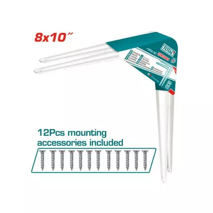 Specifications: Brand: Total Model: TSB10810 Type: Shelf Bracket Bracket Dimensions: 8 Inch x 10 Inch(20*25 cm) Thickness: 1.1mm Capacity load capacity (per pair):25kgf 6 attachment points Color: White Includes: 2 pcs Shelf Brackets, 12 screws attachment Packed by paper card