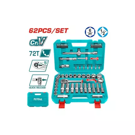 Total Socket Set 1/2" with Three Colour Soft Handle, Chromed Plated, Heat Treated THT121602 (Pack of 62pcs)