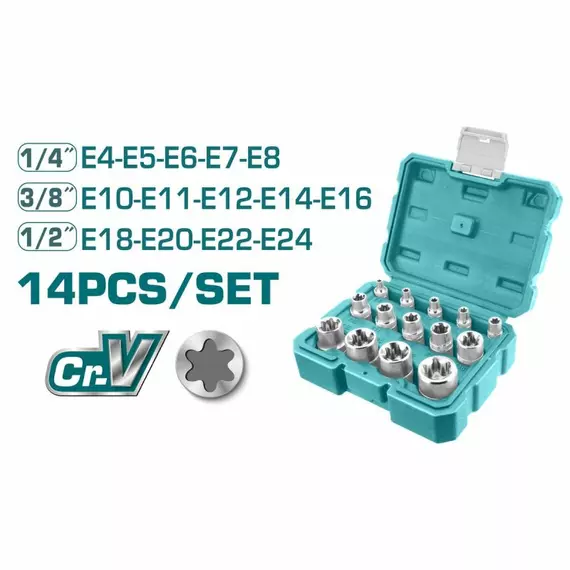 Specifications: Total 14 Pcs E-type Socket Set Includes: 5 Pcs 1/4"Socket:E4-5-6-7-8 5 Pcs 3/8"Socket:E10-11-12-14-16 4 Pcs 1/2"Socket E18-20-22-24 Material:CR-V(50BV30) Heat treated chrome plated Packed by BMC.