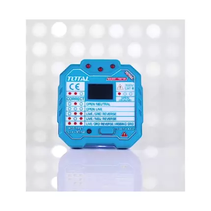 Offering an exceptional mix of modernity, design, ease of use, great range and competitive pricing, TOTAL TOOLS stands out from the crowd. So much so, TOTAL is one of the fastest-growing Tools Brand. With accurate real-time visual indication, the TOTAL multi-functional Socket Tester TESST30002 is the perfect tool for quick detection of the socket's electrical connection. Specifications: Brand: Total Model: TESST30002 Type: Socket Tester Material: Plastic Weight: 0.10 kg Control Voltage: Up to 300C AC CAT II VDE plug RCD test: >30mA Seven testing situations feedback Correct connection Open ground Open neutral Open live Live wire and ground wire reverse Live wire and neutral wire reverse Live wire and ground wire reverse, missing ground wire. Packed by double blister.