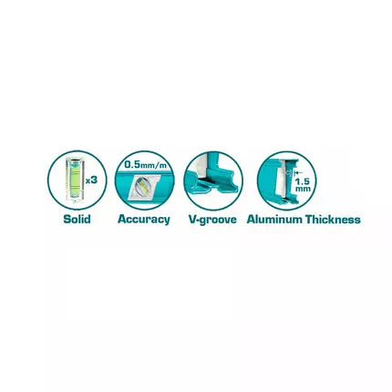 Equipped with 3 spirit vials, horizontally (180°), vertically (90°), and at an angle (45°).Aluminum frame construction to reinforce and prevent warping. With two precision-milled measuring surfaces on both sides. Plus heavy-duty, shock-absorbing rubber end caps. Featuring a V-groove that is designed to fit against round surfaces such as pipes. Specifications: Model no: TMT23086 Accuracy: 0.5mm/m Material Aluminium, Acrylonitrile butadiene styrene (ABS), Rubber Length: 30cm Thickness: 1.5mm v-shape slot for measuring objects with round surface