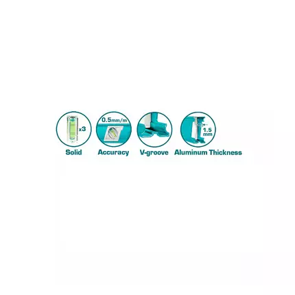 Equipped with 3 spirit vials, horizontally (180°), vertically (90°), and at an angle (45°).Aluminium frame construction to reinforced and prevent warping.With two precision-milled measuring surface on both sides.Plus heavy-duty, shock-absorbing rubber end caps.Featuring a V-groove that is designed to fit against round surfaces such as pipes. Specifications: Model no: TMT24086 Accuracy: 0.5mm/m Material Aluminium, Acrylonitrile butadiene styrene (ABS), Rubber Length: 40cm Thickness: 1.5mm V-shape slot for measuring objects with round surface