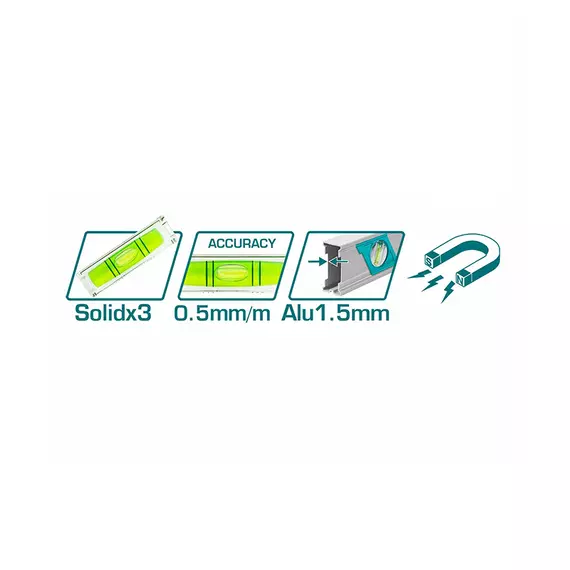 Equipped with 3 spirit vials, horizontally (180°), vertically (90°), and at an angle (45°).Aluminium frame construction to reinforced and prevent warping.And built-in strong magnets for added stability on metal surfaces.With two precision-milled measuring surface on both sides.Plus heavy-duty, shock-absorbing rubber end caps. Specifications: Model no: TMT26086M Material Frame: Aluminium Length 60cm Thickness 1.5mm 2 pcs powerful magnets double side milled 0.5mm/m accurate vials double flat surfaces design packed by color sleeve